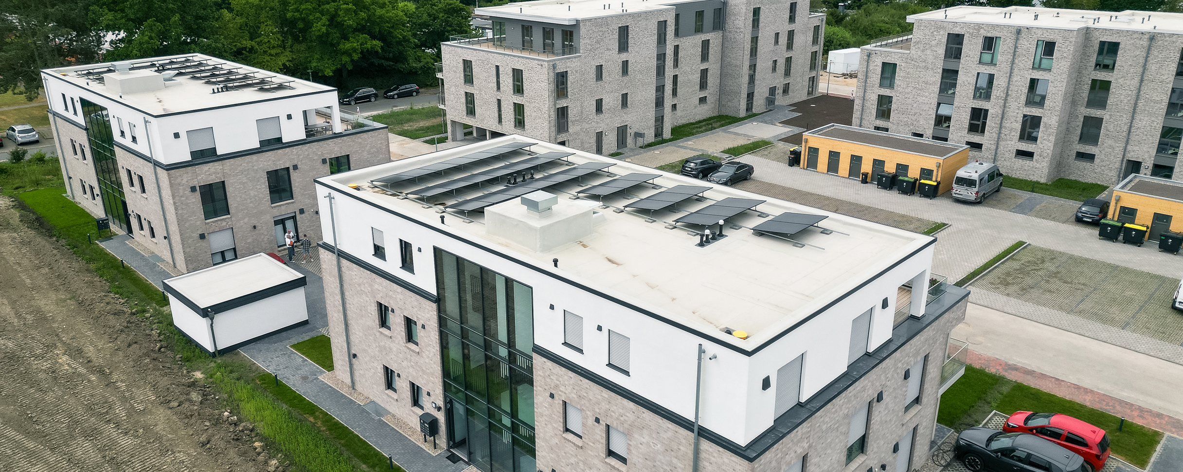 Ein modernes Bürogebäude im Gewerbepark Süd bietet flexible Mietflächen für Unternehmen unterschiedlicher Größe. Als Generalplaner verantwortete Schulte sowohl die Entwurfsplanung als auch die schlüsselfertige Ausführung. Open-Space-Konzepte, Dachterrassen und ein begrünter Innenhof schaffen attraktive Arbeitswelten. Das Gebäude erfüllt den KfW-55-Standard.